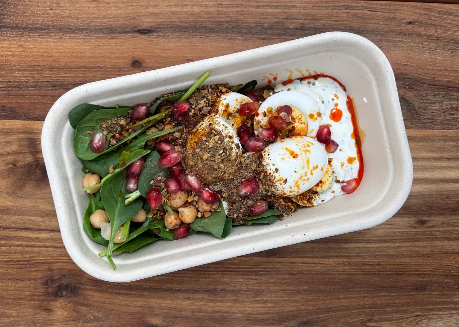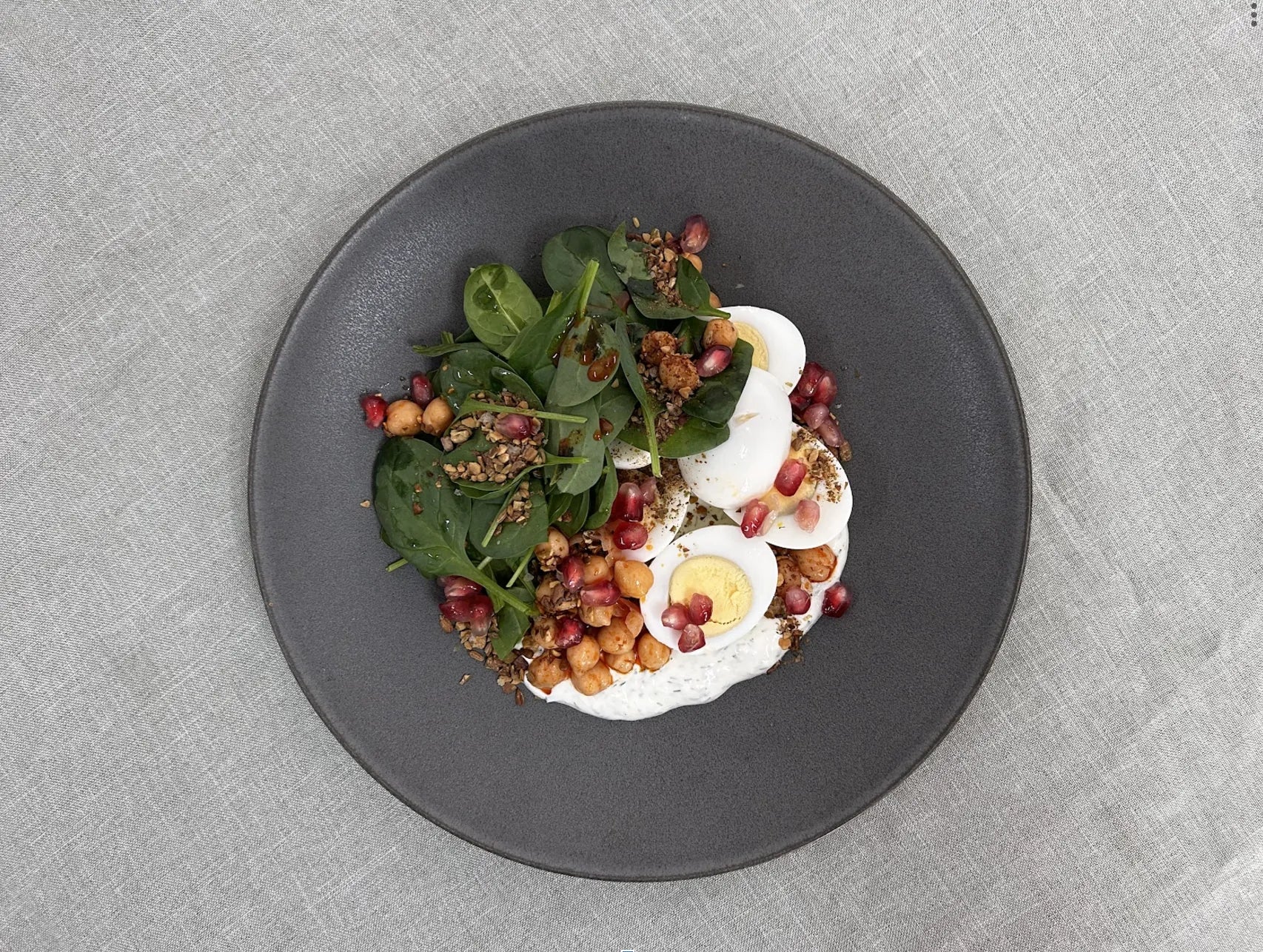 A vibrant start to your day featuring perfectly 3 soft-boiled eggs, zesty dill-infused Greek yogurt, tender harissa-spiced chickpeas, fresh spinach, and a sprinkle of pomegranate jewels. A flavorful and nourishing combination to fuel your morning!